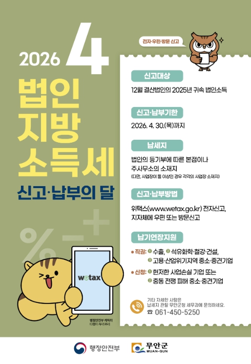 김지윤 세무과장은 “납부기한이 연장되더라도 신고는 반드시 기한 내에 완료해야 한다”며 “대상 법인에서는 불이익이 발생하지 않도록 신고 기한을 준수해 주시길 바란다”고 당부했다.